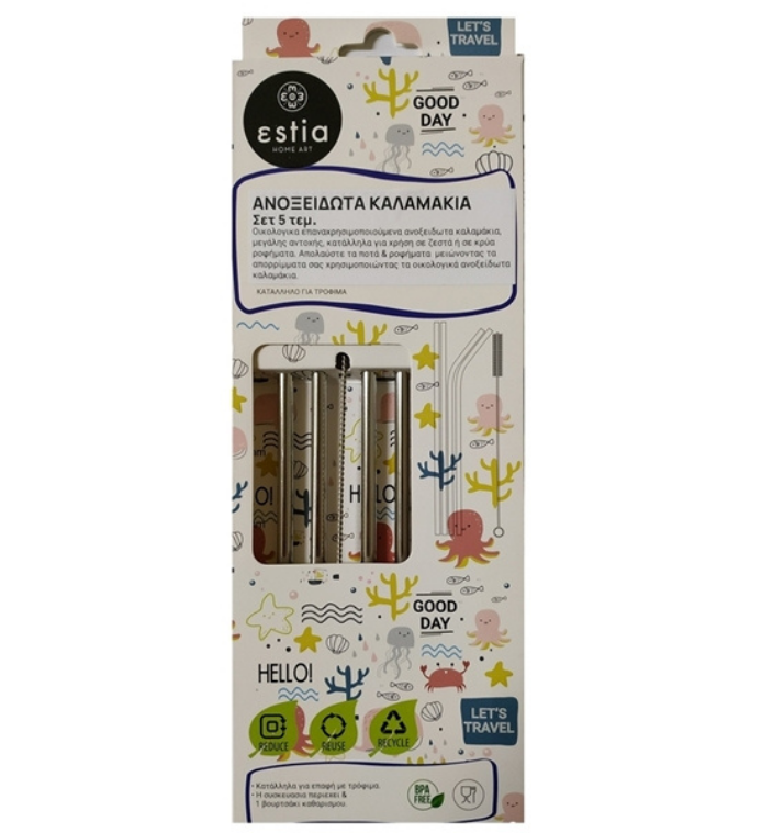 Σετ καλαμάκια της εταιρείας εstia ανοξείδωτα σε ασημί απόχρωση. Το σετ περιλαμβάνει 4 καλαμάκια σε διαφορετικά μεγέθη και σχήματα και 1 βουρτσάκι για να καθαρίζετε τα καλαμάκια ώστε να επαναχρησιμοποιούνται.