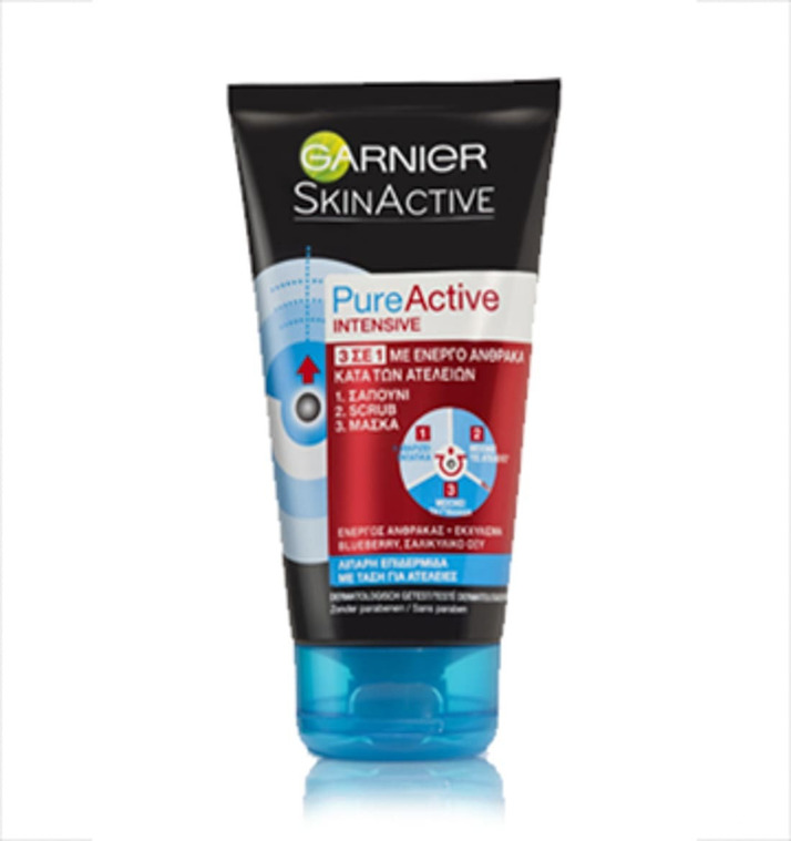 PURE ACTIVE BLACKHEADS MASK Καθαρισμός 3 σε 1 με ενεργό άνθρακα κατά των ατελειών Μπορεί να χρησιμοποιείται σαν σαπούνι, scrub & μάσκα, για να μειώνει και τις πιο επίμονες ατέλειες και να αποτρέπει την επανεμφάνιση τους: 1. Σαπούνι: Χάρη στην υψηλή του περιεκτικότητα σε σαλικυλικό οξύ, ένα εξαιρετικά αποτελεσματικό ενεργό συστατικό, εξυγιαίνει εντατικά την επιδερμίδα και απομακρύνει τους ρύπους. 2.Scrub: Περιέχει φυσικά απολεπιστικά σωματίδια, για να αποφράσει τους πόρους και να μειώνει τις ατέλειες. 3. Μάσκα: Εμπλουτισμένο με υπέρ-απορροφητικό φυτικό ενεργό άνθρακα και εκχύλισμα blueberry, μειώνει και λειαίνει την επιδερμίδα